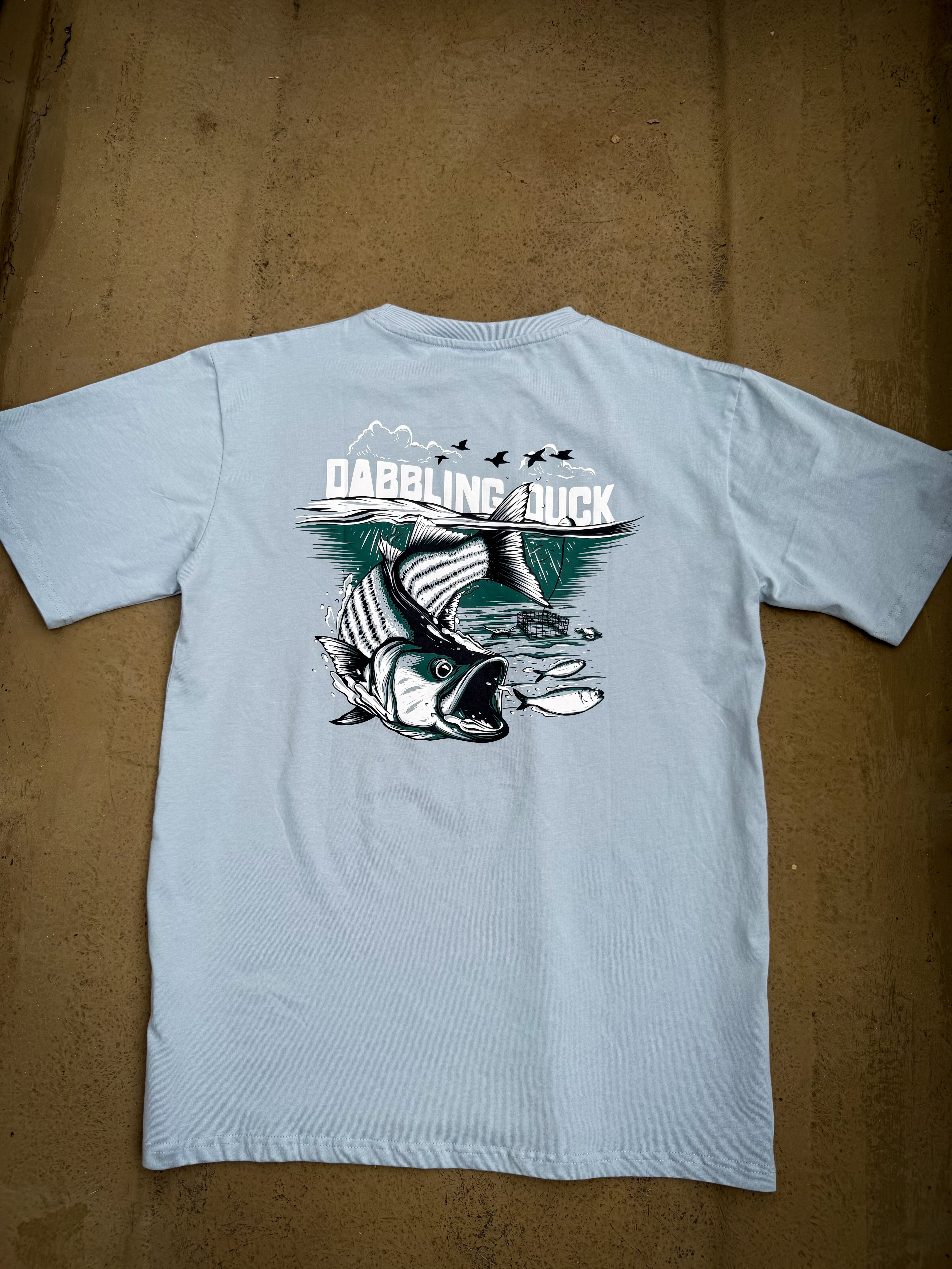 Growing up in New Jersey striped bass fishing played a big part of my life, so I thought it was finally fitting to make a t-shirt to reflect something that means so much to me. This design shows a striped bass chasing a bunker (bait fish) and in the background you will see two blue crabs and a crab trap along with some surf scoter (sea ducks) flying above the waters surface!