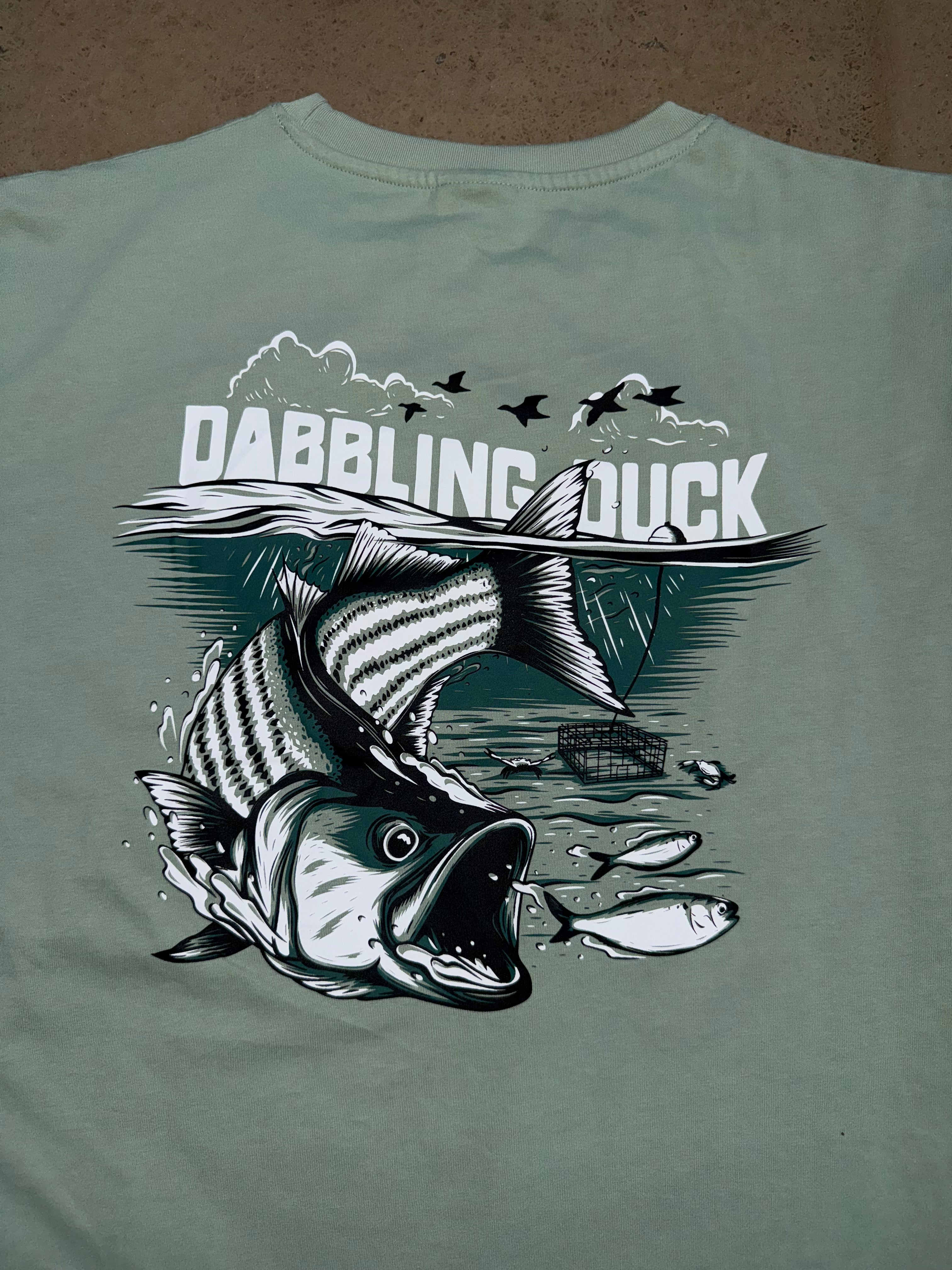 Growing up in New Jersey striped bass fishing played a big part of my life, so I thought it was finally fitting to make a t-shirt to reflect something that means so much to me. This design shows a striped bass chasing a bunker (bait fish) and in the background you will see two blue crabs and a crab trap along with some surf scoter (sea ducks) flying above the waters surface!