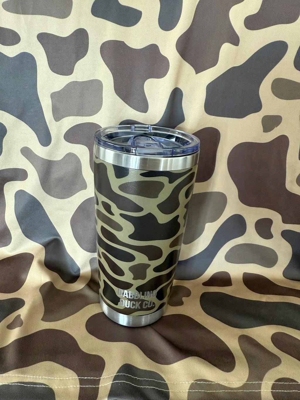 20oz stainless steel double insulated tumbler. This is a great cup for keeping your drinks super cold or super hot. Power-coated with our old school camouflage to give this tumbler a slick look